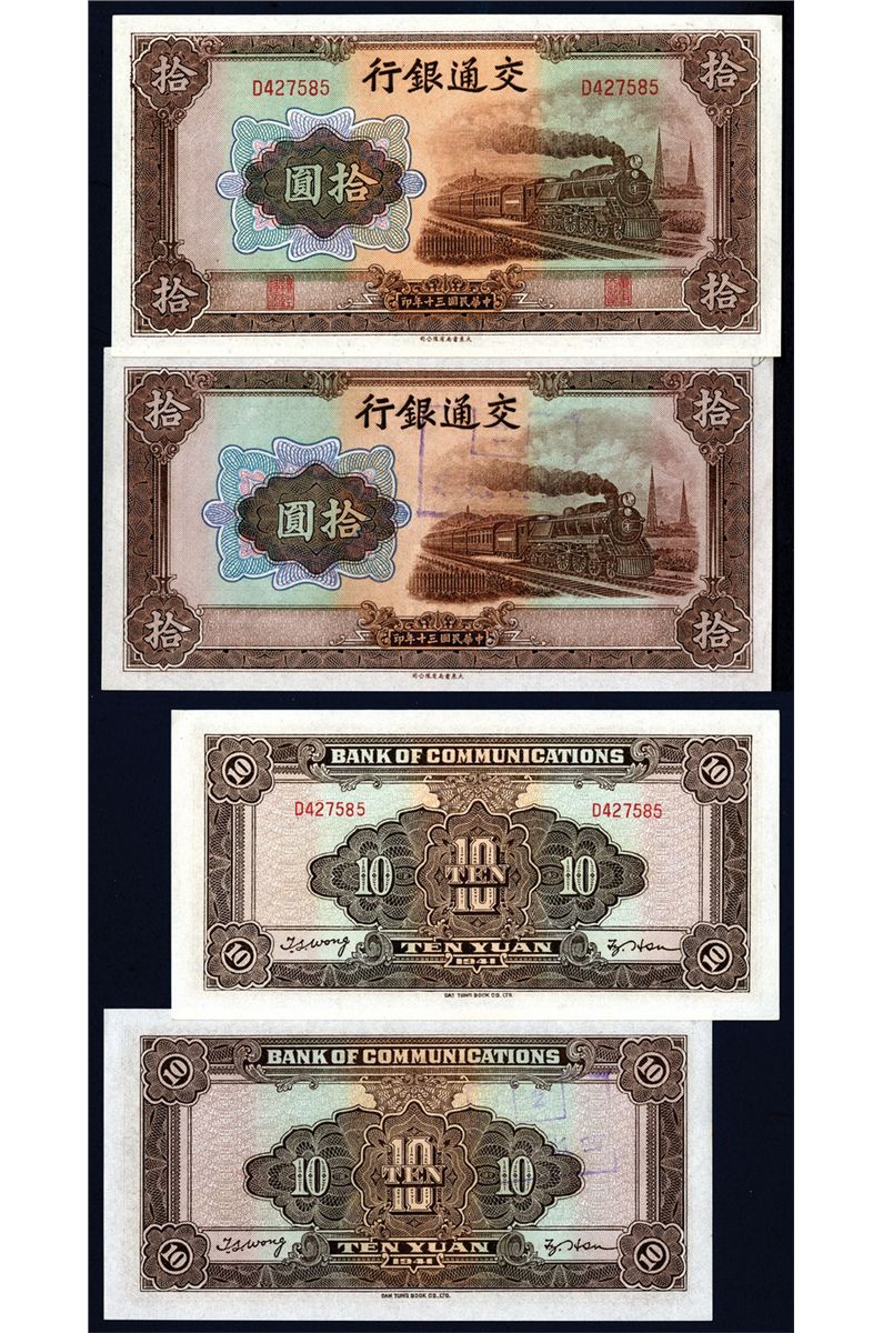 China, pair of issued 10 Yuan notes dated 1941, brown and multicolor, featuring steam passenger train. One is P-159c and carries no serial number; the second is P-159h with the serial number only on the reverse. Both CU.