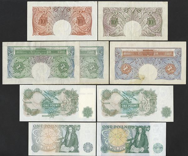 Great Britain. 10 Shillings, 1 Pound. P-366; 367a; 368c; 369a, b; 374e, g; 377a, b. Elizabeth II on many. Very Fine for the early types and Choice Very Fine to Extremely Fine for the later issues. 9 pieces.