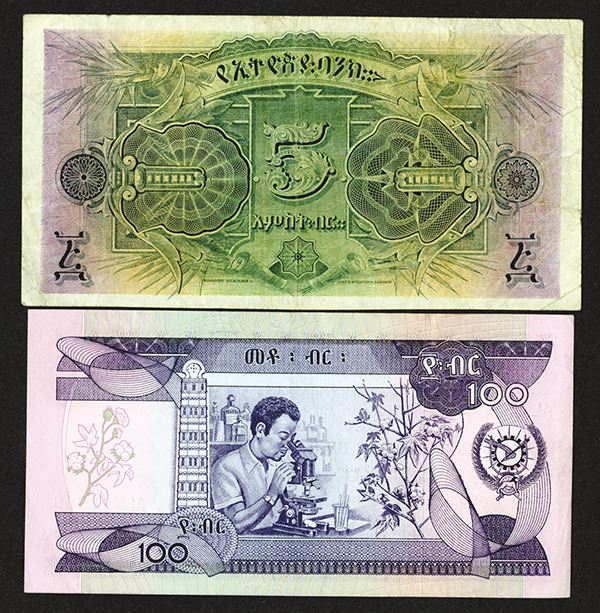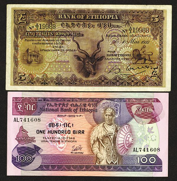 Ethiopia. 5 Thalers; 100 Birr. P-7 1.5.1932; 40. First is Fine and probably processed; the latter is Choice About Uncirculated.