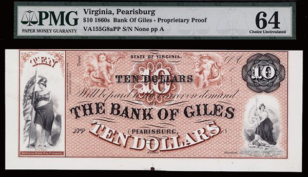 Pearisburg, Virginia. 18xx (originally printed in 1860's, these are ca.1960-70's), $10, (VA-155-G8aPP), Modern “Proprietary Proofs”. the $10 note has cherubs on upper left and right with standing Liberty on right and Liberty with flag on left. Black printing with plum red underprint printed on thin white card, PMG graded Choice Uncirculated 64 , ABNC. (ABN Commemoratives, AIA XI, May 15, 2012)