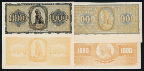 Greece, 1942. 1000 Drachmai, P-118 Unlisted Proofs. 4 different progressive proofs of the faces and backs. Group includes one partially printed proof with a complete back and partially printed face; additional progress proof combinations. All are extremely rare and are from a new find. AU to gem uncirculated. Printed locally in Greece during the war.