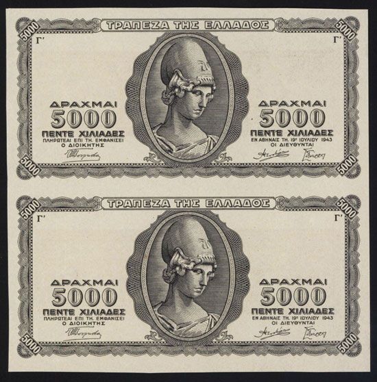 Greece, 1943. Progress face uncut proof pair (2 notes). 5000 Drachmai, P-122 Unlisted, Includes Black and white uniface front proof pair. Uncirculated to CU condition. Rare and attractive Inflation era proofs by Greek local printer.