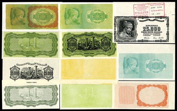 Greece, P-123 Unlisted Proofs. 25,000 Drachmai. 11 different progressive proofs of undertints, text and vignettes in various colors. Includes one uniface proof banknote of face title, vignette and text in black and additional progress proofs at various stages, AU to Choice uncirculated. Printed locally in Greece during the war.
