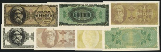 Greece, 1944. Lot of 7 progress proofs. 500,000 Drachmai, P-126 Unlisted, Includes complete note without overprints or S/N's and many other progress proof designs, All are in Uncirculated to CU condition. Rare and attractive Inflation era progress proofs by Greek local printer.
