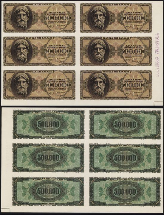 Greece, 1944. 500,000 Drachmai, P-126 Unlisted, Uncut sheet of 6 fully printed notes except for overprints and S/N's. Uncirculated to CU condition. Rare and attractive Inflation era progress proofs by Greek local printer.