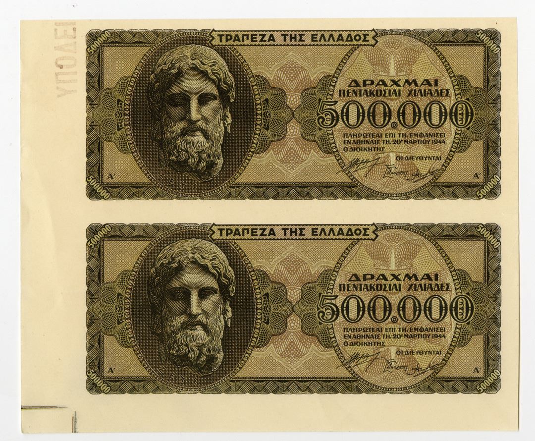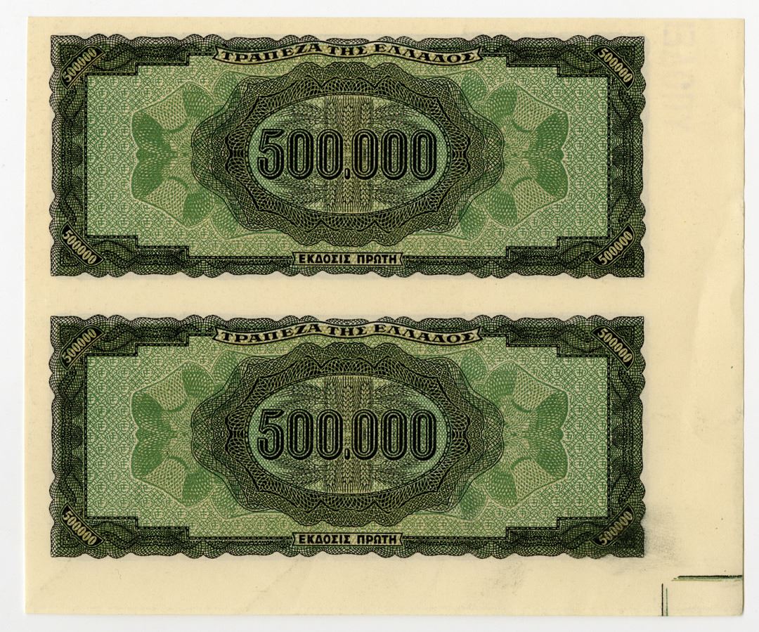 Greece. 1944 Inflation Issue, 500,000 Drachmai, P-126, Black on dull violet-brown underprint, Zeus at left, Back is green. Unc. with wide margin at left. No serial numbers or overprints. (2)