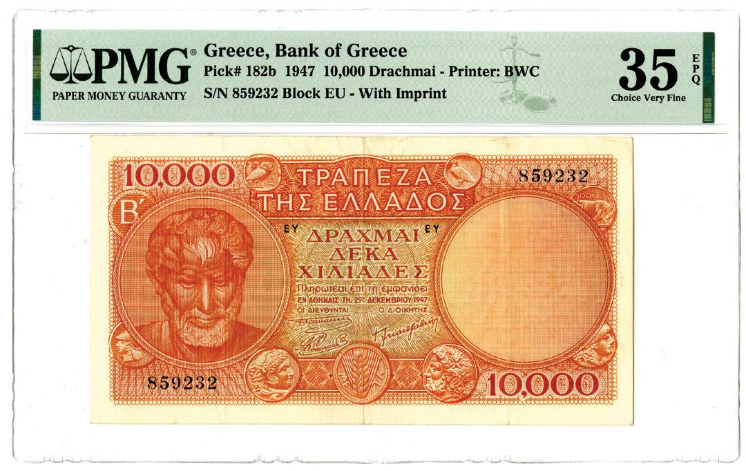 Greece. 1947. 10,000 Drachmai, P-182b, Issued banknote, Orange on face, S/N 859232 Block EU - With Imprint, PMG graded Choice Very Fine 35 EPQ. Printer: BWC.