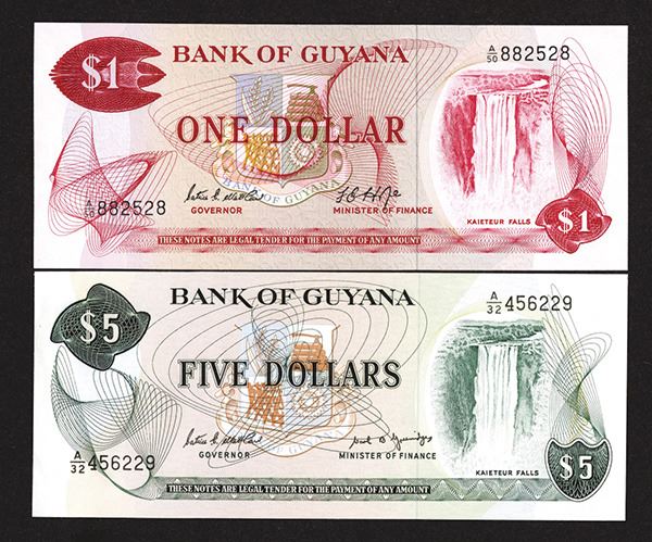 Guyana. 1, 5 Dollars. SCWPM 21d, 22e. Both with Kaietiur Falls at right and signature 5 or 7 respectively. Both Choice Uncirculated. 2 pieces.