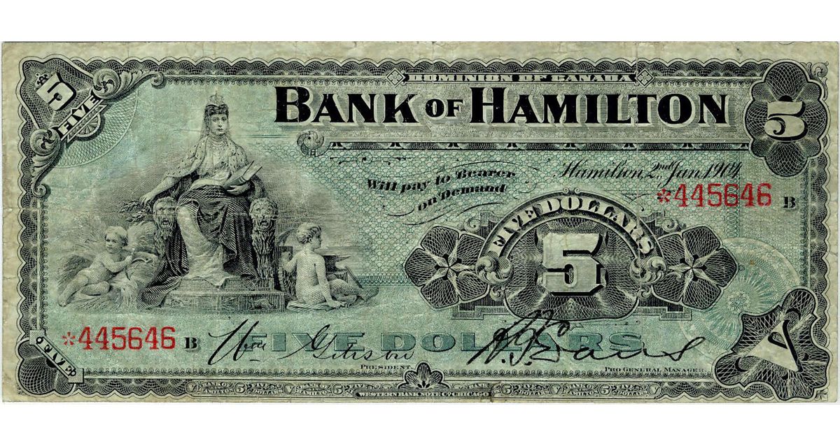 Bank of Hamilton; 1904 $5 #445646 CH-345-18-02 PMG F12 Net. Popular issue with with strong colours. Minor splits.