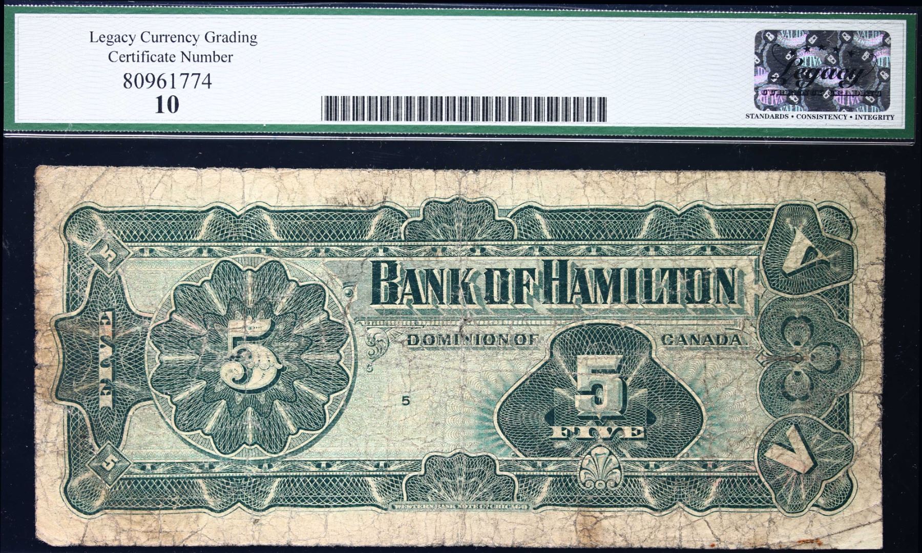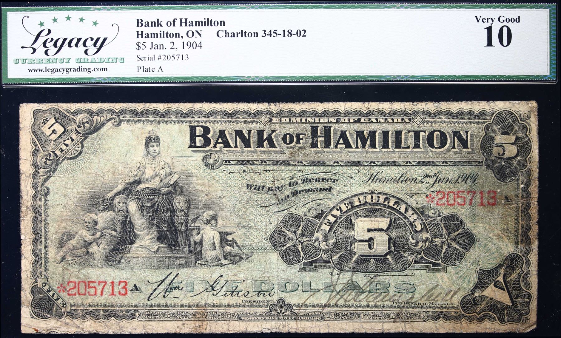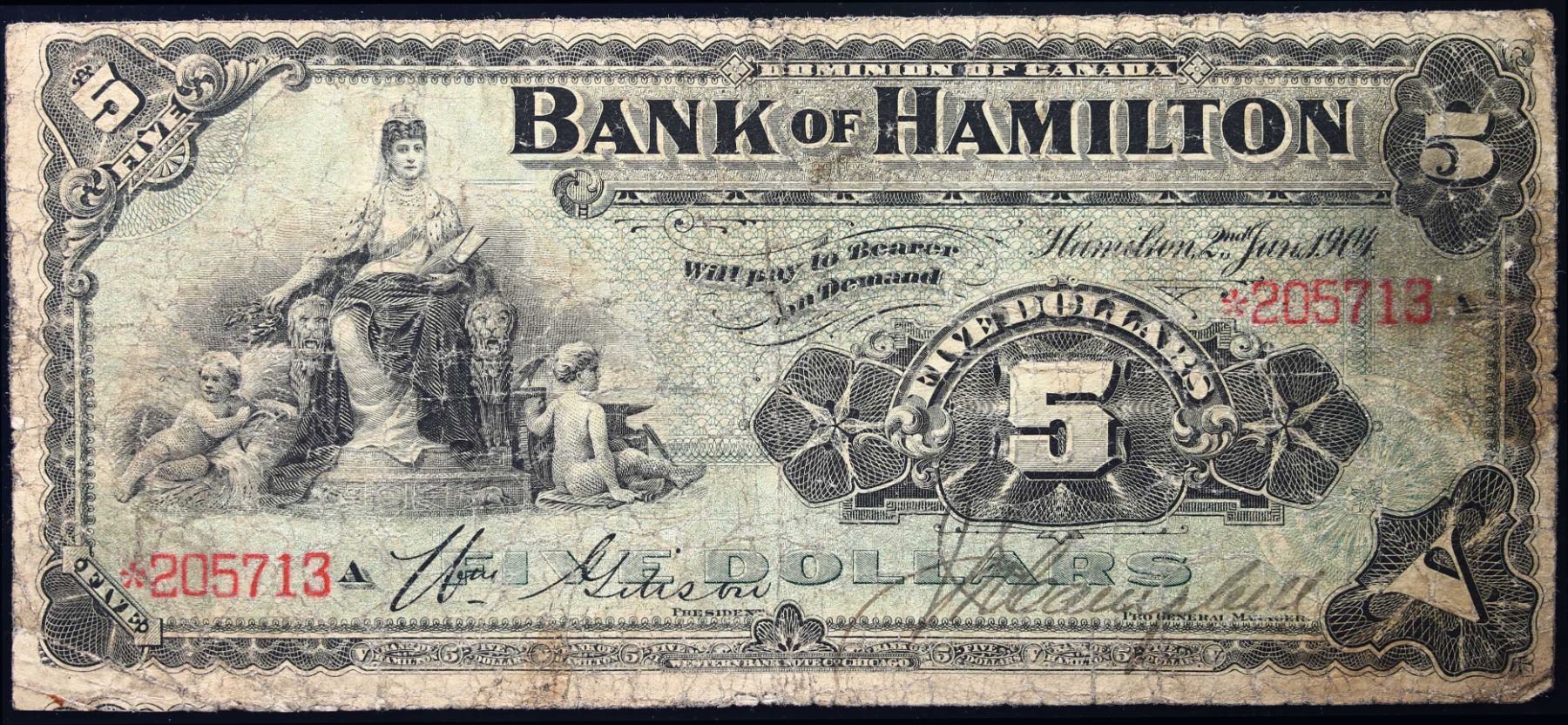 Bank of Hamilton 1904 $5 CH-345-18-02 #205713 LCG Very Good-10. A scarce early type note.