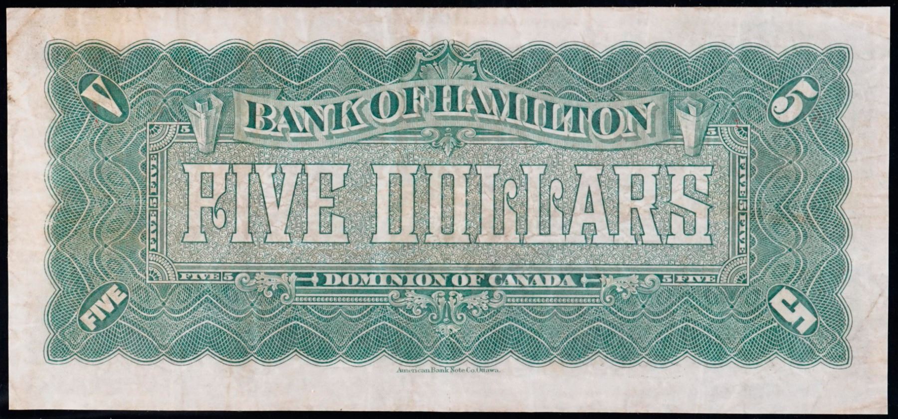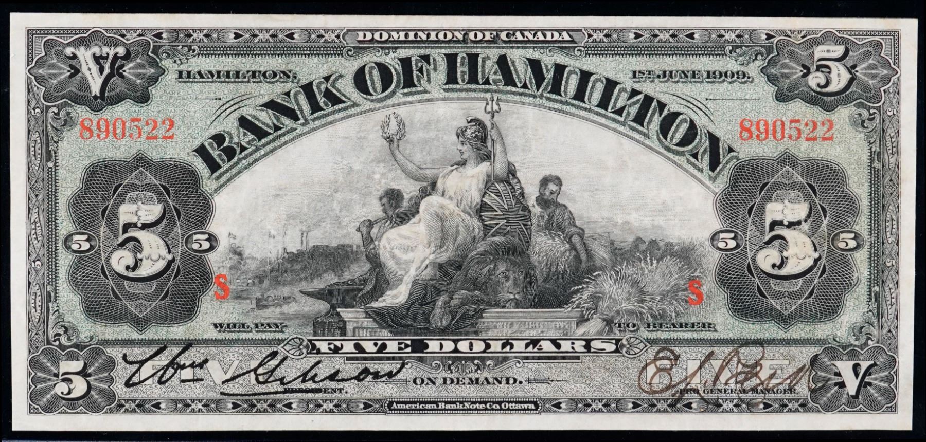 Bank of Hamilton 1909 $5 CH-345-20-02b "Test Note Letter "SS" A bright VF+ example. Very scarce and seldom offered.