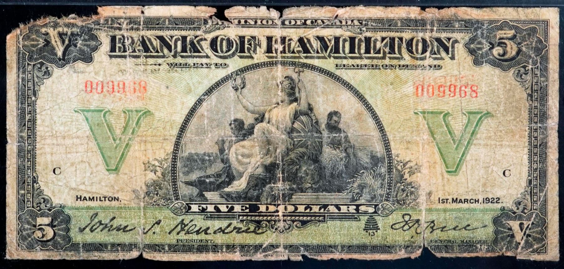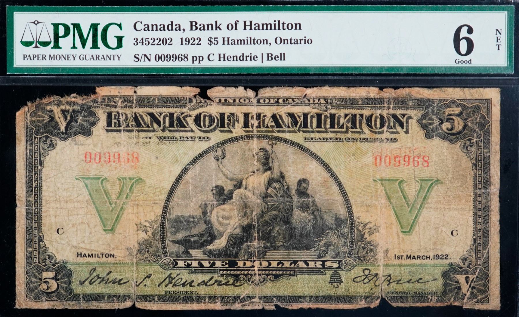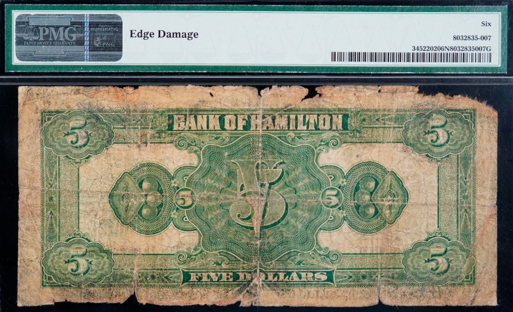 Bank of Hamilton 1922 $5 CH-345-22-02 009968 PMG Good-6 with issues. Rare and seldom offered!