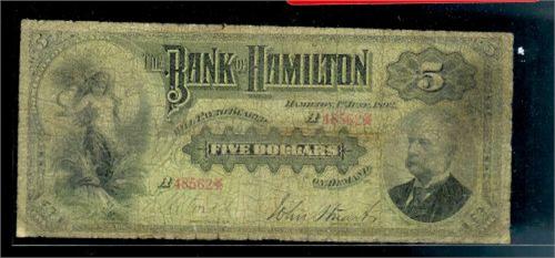 Bank of Hamilton 345-16-02a 1892 $5 about VG #D64723. Another scarce example.