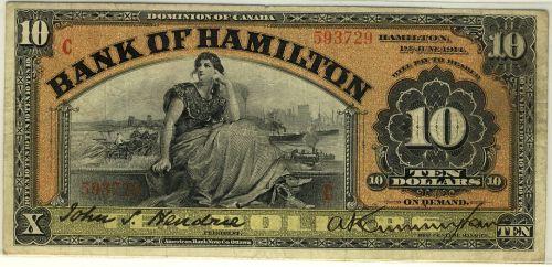 Bank of Hamilton 345-20-10 1914 $10 VF+. Letter "C" overprint #593729. Another scarce example.