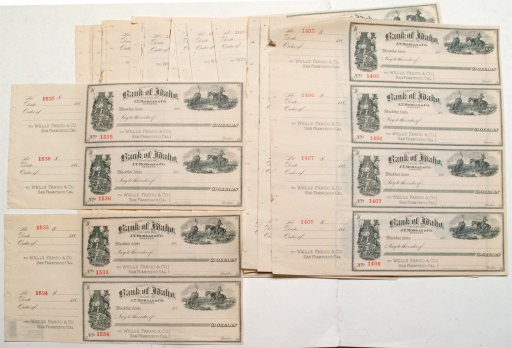 36 sheets of unused Bank of Idaho, J. T. Morgan & Company bankers sheets. Each says Wells Fargo & Company on them. Some curling, but in nearly flawless condition.City: BlackfootCounty: BinghamState: ID