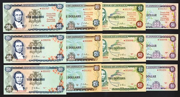 Jamaica. 1, 2, 5, 10 Dollars. SCWPM CS3. Plus Series 1978 set of matched serial #s. In addition CS2, Series 1977 set with matching serial #s. All Choice Uncirculated. 12 pieces.