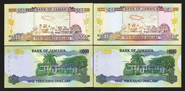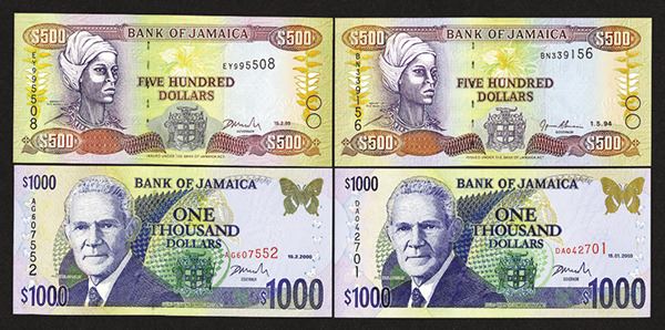 Jamaica. 500, 1000 Dollars. SCWPM 77a, b; 78a, 86a. Includes 1.5.1994 Signature 12 for the first date of the 500s, and 15.2.1999 as the last date of the type. For the 1000s, 15.2.2000 and 15.1.2003 are the first dates for the types. All Very Choice Uncirculated with bold embossing. 4 pieces. (Arthur C. Matz Collection)