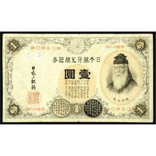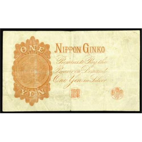 <style type="text/css"> body, td, th { font-family: Arial, Helvetica, sans-serif; font-size: 12px; color: #482424; margin: 0px; padding: 0px; } #header { background-image: url(http://www.bowersandmerena.com/ebay/images/template_v3_01.gif); clear: both; background-color: #590303; border-top-width: 2px; border-top-style: solid; border-top-color: #B38C4F; } #header #header_wrapper { height: 75px; clear: both; width: 800px; margin-right: auto; margin-left: auto; background-image: url(http://www.bowersandmerena.com/ebay/images/template_v3_03.gif); background-repeat: no-repeat; background-position: right; color: #F3EDCC; } #header #header_wrapper #header_logo { float: left; height: 75px; width: 444px; background-image: url(http://www.bowersandmerena.com/ebay/images/template_v3_02.gif); background-repeat: no-repeat; font-size: 10px; text-transform: capitalize; color: #B38C4F; } #header #header_wrapper #header_right { float: left; height: 75px; width: 356px; text-align: right; } #header #header_wrapper #header_right #headerLoginBtn { margin-bottom: 30px; } #header #header_wrapper #header_right input#txtSearch { color: #B49056; border: 1px solid #B49056; width: 175px; padding-top: 3px; padding-right: 3px; padding-bottom: 4px; padding-left: 3px; } #nav { height: 37px; background-image: url(http://www.bowersandmerena.com/ebay/images/template_v3_05.gif); clear: both; } #nav #nav_wrapper { height: 35px; width: 800px; margin-right: auto; margin-left: auto; border-left-width: 1px; border-left-style: solid; border-left-color: #B38C4F; } #nav #nav_wrapper a { padding-right: 15px; padding-left: 15px; border-right-width: 1px; border-right-style: solid; border-right-color: #B38C4F; height: 25px; padding-top: 10px; display: block; float: left; text-decoration: none; font-weight: bold; color: #5D0303; } #nav #nav_wrapper a:hover { color: #B38C4F; } #nav #nav_wrapper #search { float: right; padding-top: 7px; } #nav #nav_wrapper #search #txtSearch { font-family: Arial, Helvetica, sans-serif; font-size: 10px; text-transform: uppercase; color: #D2AE75; border: 1px solid #B38C4F; padding: 3px; } #content_bgd { background-image: url(http://www.bowersandmerena.com/ebay/images/template_v3_09.gif); background-repeat: repeat-y; background-position: center; padding-top: 15px; padding-bottom: 15px; background-color: #FBFBDB; } #content_wrapper { clear: both; height: auto; width: 800px; margin-right: auto; margin-left: auto; } .LotDetailWhite { line-height:normal; font-size:13px; font-family: arial,helvetica,sans-serif; color: White; font-weight: bold; } .LotDetailInformation { line-height:normal; font-size: 13px; font-family: arial,helvetica,sans-serif; } .LotDetailMessage { line-height:normal; font-size: 13px; font-family: arial,helvetica,sans-serif; color: red; } } tr.HeaderAuctionTitle td { color: #000000; font-weight: bold; padding: 2px; background-image: url(http://www.bowersandmerena.com/ebay/images/template_v3_05.gif); background-repeat: repeat-x; border-bottom-width: 1px; border-bottom-style: solid; border-bottom-color: #B38C4F; } table.AuctionSummary a, table.AuctionSummary a:link, table.AuctionSummary a:visited { color: #0000FF; text-decoration: none; } } td.tableHeaderLeft { border-left-width: 1px; border-left-style: solid; border-left-color: #B38C4F; } td.tableHeaderRight { border-right-width: 1px; border-right-style: solid; border-right-color: #B38C4F; } td.tableCellMiddle { border-left-width: 1px; border-left-style: solid; border-left-color: #B38C4F; border-right-width: 1px; border-right-style: solid; border-right-color: #B38C4F; padding: 5px; } tr.footer td { border-top-width: 1px; border-top-style: solid; border-top-color: #B38C4F; } </style> </head> <body> <div id="header"> <div id="header_wrapper"> <div id="header_logo"> </div> <div id="header_right"> </div> </div> </div> <div id="nav"> <div id="nav_wrapper"> <a href="http://www.bowersandmerena.com">Our eBayLive Auctions</a> <a href="#PaymentInfo">Payment Information</a> <a href="#ShippingInfo">Shipping Information</a> <a href="#About">About Bowers and Merena</a> </div> </div> <div id="content_bgd"> <div id="content_wrapper"> <table width="100%" border="0" cellpadding="5" cellspacing="0" class="AuctionSummary"> <tbody> <tr class="HeaderAuctionTitle" style="height: 25px;"> <td align="left" class="tableHeaderLeft" > </td> <td align="center" class="tableHeaderRight"> <span style="font-size: large;">Lot #1002. Japan. Bank of Japan, 1889-91 Convertible Silver Note Issue.</span> </td> </tr> <tr> <td colspan="3" class="tableCellMiddle"> ND (1889), 1 Yen in Silver, P-26, VF condition, Takeuchi Sikune at right, scarce note.