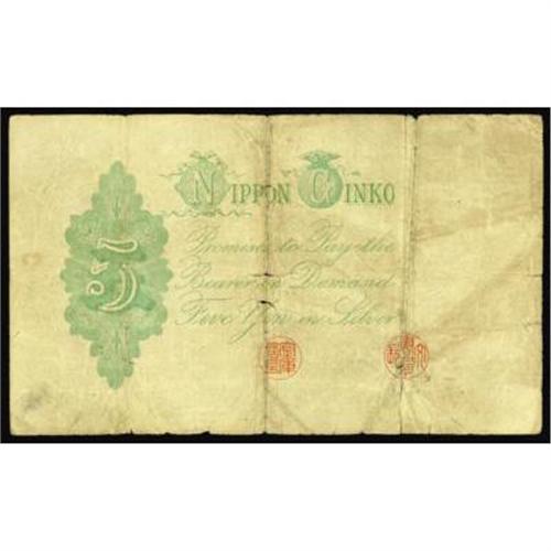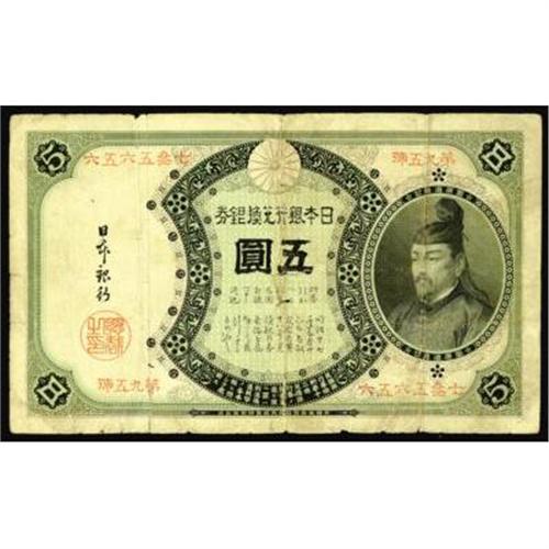 <style type="text/css"> body, td, th { font-family: Arial, Helvetica, sans-serif; font-size: 12px; color: #482424; margin: 0px; padding: 0px; } #header { background-image: url(http://www.bowersandmerena.com/ebay/images/template_v3_01.gif); clear: both; background-color: #590303; border-top-width: 2px; border-top-style: solid; border-top-color: #B38C4F; } #header #header_wrapper { height: 75px; clear: both; width: 800px; margin-right: auto; margin-left: auto; background-image: url(http://www.bowersandmerena.com/ebay/images/template_v3_03.gif); background-repeat: no-repeat; background-position: right; color: #F3EDCC; } #header #header_wrapper #header_logo { float: left; height: 75px; width: 444px; background-image: url(http://www.bowersandmerena.com/ebay/images/template_v3_02.gif); background-repeat: no-repeat; font-size: 10px; text-transform: capitalize; color: #B38C4F; } #header #header_wrapper #header_right { float: left; height: 75px; width: 356px; text-align: right; } #header #header_wrapper #header_right #headerLoginBtn { margin-bottom: 30px; } #header #header_wrapper #header_right input#txtSearch { color: #B49056; border: 1px solid #B49056; width: 175px; padding-top: 3px; padding-right: 3px; padding-bottom: 4px; padding-left: 3px; } #nav { height: 37px; background-image: url(http://www.bowersandmerena.com/ebay/images/template_v3_05.gif); clear: both; } #nav #nav_wrapper { height: 35px; width: 800px; margin-right: auto; margin-left: auto; border-left-width: 1px; border-left-style: solid; border-left-color: #B38C4F; } #nav #nav_wrapper a { padding-right: 15px; padding-left: 15px; border-right-width: 1px; border-right-style: solid; border-right-color: #B38C4F; height: 25px; padding-top: 10px; display: block; float: left; text-decoration: none; font-weight: bold; color: #5D0303; } #nav #nav_wrapper a:hover { color: #B38C4F; } #nav #nav_wrapper #search { float: right; padding-top: 7px; } #nav #nav_wrapper #search #txtSearch { font-family: Arial, Helvetica, sans-serif; font-size: 10px; text-transform: uppercase; color: #D2AE75; border: 1px solid #B38C4F; padding: 3px; } #content_bgd { background-image: url(http://www.bowersandmerena.com/ebay/images/template_v3_09.gif); background-repeat: repeat-y; background-position: center; padding-top: 15px; padding-bottom: 15px; background-color: #FBFBDB; } #content_wrapper { clear: both; height: auto; width: 800px; margin-right: auto; margin-left: auto; } .LotDetailWhite { line-height:normal; font-size:13px; font-family: arial,helvetica,sans-serif; color: White; font-weight: bold; } .LotDetailInformation { line-height:normal; font-size: 13px; font-family: arial,helvetica,sans-serif; } .LotDetailMessage { line-height:normal; font-size: 13px; font-family: arial,helvetica,sans-serif; color: red; } } tr.HeaderAuctionTitle td { color: #000000; font-weight: bold; padding: 2px; background-image: url(http://www.bowersandmerena.com/ebay/images/template_v3_05.gif); background-repeat: repeat-x; border-bottom-width: 1px; border-bottom-style: solid; border-bottom-color: #B38C4F; } table.AuctionSummary a, table.AuctionSummary a:link, table.AuctionSummary a:visited { color: #0000FF; text-decoration: none; } } td.tableHeaderLeft { border-left-width: 1px; border-left-style: solid; border-left-color: #B38C4F; } td.tableHeaderRight { border-right-width: 1px; border-right-style: solid; border-right-color: #B38C4F; } td.tableCellMiddle { border-left-width: 1px; border-left-style: solid; border-left-color: #B38C4F; border-right-width: 1px; border-right-style: solid; border-right-color: #B38C4F; padding: 5px; } tr.footer td { border-top-width: 1px; border-top-style: solid; border-top-color: #B38C4F; } </style> </head> <body> <div id="header"> <div id="header_wrapper"> <div id="header_logo"> </div> <div id="header_right"> </div> </div> </div> <div id="nav"> <div id="nav_wrapper"> <a href="http://www.bowersandmerena.com">Our eBayLive Auctions</a> <a href="#PaymentInfo">Payment Information</a> <a href="#ShippingInfo">Shipping Information</a> <a href="#About">About Bowers and Merena</a> </div> </div> <div id="content_bgd"> <div id="content_wrapper"> <table width="100%" border="0" cellpadding="5" cellspacing="0" class="AuctionSummary"> <tbody> <tr class="HeaderAuctionTitle" style="height: 25px;"> <td align="left" class="tableHeaderLeft" > </td> <td align="center" class="tableHeaderRight"> <span style="font-size: large;">Lot #1003. Japan. Bank of Japan, 1889-91 Convertible Silver Note Issue.</span> </td> </tr> <tr> <td colspan="3" class="tableCellMiddle"> ND (1888), 5 Yen in Silver, P-27, Fine condition with internal very small wear areas starting to separate in a few places, Sugawara Michizane at right, rare note.