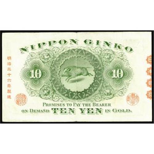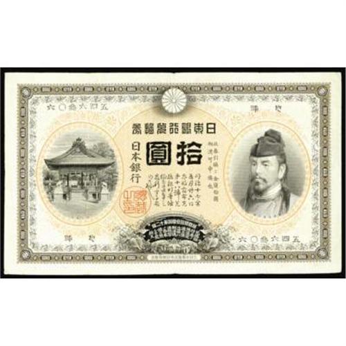 <style type="text/css"> body, td, th { font-family: Arial, Helvetica, sans-serif; font-size: 12px; color: #482424; margin: 0px; padding: 0px; } #header { background-image: url(http://www.bowersandmerena.com/ebay/images/template_v3_01.gif); clear: both; background-color: #590303; border-top-width: 2px; border-top-style: solid; border-top-color: #B38C4F; } #header #header_wrapper { height: 75px; clear: both; width: 800px; margin-right: auto; margin-left: auto; background-image: url(http://www.bowersandmerena.com/ebay/images/template_v3_03.gif); background-repeat: no-repeat; background-position: right; color: #F3EDCC; } #header #header_wrapper #header_logo { float: left; height: 75px; width: 444px; background-image: url(http://www.bowersandmerena.com/ebay/images/template_v3_02.gif); background-repeat: no-repeat; font-size: 10px; text-transform: capitalize; color: #B38C4F; } #header #header_wrapper #header_right { float: left; height: 75px; width: 356px; text-align: right; } #header #header_wrapper #header_right #headerLoginBtn { margin-bottom: 30px; } #header #header_wrapper #header_right input#txtSearch { color: #B49056; border: 1px solid #B49056; width: 175px; padding-top: 3px; padding-right: 3px; padding-bottom: 4px; padding-left: 3px; } #nav { height: 37px; background-image: url(http://www.bowersandmerena.com/ebay/images/template_v3_05.gif); clear: both; } #nav #nav_wrapper { height: 35px; width: 800px; margin-right: auto; margin-left: auto; border-left-width: 1px; border-left-style: solid; border-left-color: #B38C4F; } #nav #nav_wrapper a { padding-right: 15px; padding-left: 15px; border-right-width: 1px; border-right-style: solid; border-right-color: #B38C4F; height: 25px; padding-top: 10px; display: block; float: left; text-decoration: none; font-weight: bold; color: #5D0303; } #nav #nav_wrapper a:hover { color: #B38C4F; } #nav #nav_wrapper #search { float: right; padding-top: 7px; } #nav #nav_wrapper #search #txtSearch { font-family: Arial, Helvetica, sans-serif; font-size: 10px; text-transform: uppercase; color: #D2AE75; border: 1px solid #B38C4F; padding: 3px; } #content_bgd { background-image: url(http://www.bowersandmerena.com/ebay/images/template_v3_09.gif); background-repeat: repeat-y; background-position: center; padding-top: 15px; padding-bottom: 15px; background-color: #FBFBDB; } #content_wrapper { clear: both; height: auto; width: 800px; margin-right: auto; margin-left: auto; } .LotDetailWhite { line-height:normal; font-size:13px; font-family: arial,helvetica,sans-serif; color: White; font-weight: bold; } .LotDetailInformation { line-height:normal; font-size: 13px; font-family: arial,helvetica,sans-serif; } .LotDetailMessage { line-height:normal; font-size: 13px; font-family: arial,helvetica,sans-serif; color: red; } } tr.HeaderAuctionTitle td { color: #000000; font-weight: bold; padding: 2px; background-image: url(http://www.bowersandmerena.com/ebay/images/template_v3_05.gif); background-repeat: repeat-x; border-bottom-width: 1px; border-bottom-style: solid; border-bottom-color: #B38C4F; } table.AuctionSummary a, table.AuctionSummary a:link, table.AuctionSummary a:visited { color: #0000FF; text-decoration: none; } } td.tableHeaderLeft { border-left-width: 1px; border-left-style: solid; border-left-color: #B38C4F; } td.tableHeaderRight { border-right-width: 1px; border-right-style: solid; border-right-color: #B38C4F; } td.tableCellMiddle { border-left-width: 1px; border-left-style: solid; border-left-color: #B38C4F; border-right-width: 1px; border-right-style: solid; border-right-color: #B38C4F; padding: 5px; } tr.footer td { border-top-width: 1px; border-top-style: solid; border-top-color: #B38C4F; } </style> </head> <body> <div id="header"> <div id="header_wrapper"> <div id="header_logo"> </div> <div id="header_right"> </div> </div> </div> <div id="nav"> <div id="nav_wrapper"> <a href="http://www.bowersandmerena.com">Our eBayLive Auctions</a> <a href="#PaymentInfo">Payment Information</a> <a href="#ShippingInfo">Shipping Information</a> <a href="#About">About Bowers and Merena</a> </div> </div> <div id="content_bgd"> <div id="content_wrapper"> <table width="100%" border="0" cellpadding="5" cellspacing="0" class="AuctionSummary"> <tbody> <tr class="HeaderAuctionTitle" style="height: 25px;"> <td align="left" class="tableHeaderLeft" > </td> <td align="center" class="tableHeaderRight"> <span style="font-size: large;">Lot #1004. Japan. Bank of Japan, 1899-1900 Convertible Gold Note Issue.</span> </td> </tr> <tr> <td colspan="3" class="tableCellMiddle"> 1899-1913, 10 Yen in Gold, P-32, Choice XF condition with great color, margins and paper quality, a premium example of this extremely rare note, Wakeno Kiyomaro at right, a trophy note.