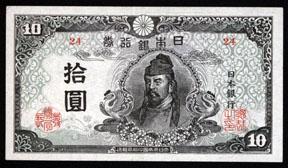 ND (1945). 10 Yen, P-77a. With watermark. Face with Portrait of Kiyomaro in center in black on light green, back is brown. Block 24. Slight mishandling on bottom border has left a slight bend in the paper causing this lovely well centered note to grade AU instead of the Uncirculated that it once was. Scarce in this high grade. Note catalogs $175 in Unc.
