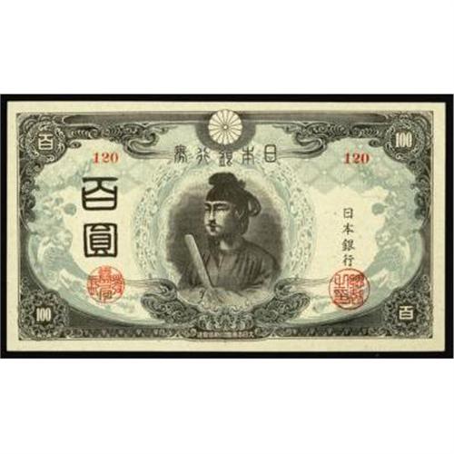 <style type="text/css"> body, td, th { font-family: Arial, Helvetica, sans-serif; font-size: 12px; color: #482424; margin: 0px; padding: 0px; } #header { background-image: url(http://www.bowersandmerena.com/ebay/images/template_v3_01.gif); clear: both; background-color: #590303; border-top-width: 2px; border-top-style: solid; border-top-color: #B38C4F; } #header #header_wrapper { height: 75px; clear: both; width: 800px; margin-right: auto; margin-left: auto; background-image: url(http://www.bowersandmerena.com/ebay/images/template_v3_03.gif); background-repeat: no-repeat; background-position: right; color: #F3EDCC; } #header #header_wrapper #header_logo { float: left; height: 75px; width: 444px; background-image: url(http://www.bowersandmerena.com/ebay/images/template_v3_02.gif); background-repeat: no-repeat; font-size: 10px; text-transform: capitalize; color: #B38C4F; } #header #header_wrapper #header_right { float: left; height: 75px; width: 356px; text-align: right; } #header #header_wrapper #header_right #headerLoginBtn { margin-bottom: 30px; } #header #header_wrapper #header_right input#txtSearch { color: #B49056; border: 1px solid #B49056; width: 175px; padding-top: 3px; padding-right: 3px; padding-bottom: 4px; padding-left: 3px; } #nav { height: 37px; background-image: url(http://www.bowersandmerena.com/ebay/images/template_v3_05.gif); clear: both; } #nav #nav_wrapper { height: 35px; width: 800px; margin-right: auto; margin-left: auto; border-left-width: 1px; border-left-style: solid; border-left-color: #B38C4F; } #nav #nav_wrapper a { padding-right: 15px; padding-left: 15px; border-right-width: 1px; border-right-style: solid; border-right-color: #B38C4F; height: 25px; padding-top: 10px; display: block; float: left; text-decoration: none; font-weight: bold; color: #5D0303; } #nav #nav_wrapper a:hover { color: #B38C4F; } #nav #nav_wrapper #search { float: right; padding-top: 7px; } #nav #nav_wrapper #search #txtSearch { font-family: Arial, Helvetica, sans-serif; font-size: 10px; text-transform: uppercase; color: #D2AE75; border: 1px solid #B38C4F; padding: 3px; } #content_bgd { background-image: url(http://www.bowersandmerena.com/ebay/images/template_v3_09.gif); background-repeat: repeat-y; background-position: center; padding-top: 15px; padding-bottom: 15px; background-color: #FBFBDB; } #content_wrapper { clear: both; height: auto; width: 800px; margin-right: auto; margin-left: auto; } .LotDetailWhite { line-height:normal; font-size:13px; font-family: arial,helvetica,sans-serif; color: White; font-weight: bold; } .LotDetailInformation { line-height:normal; font-size: 13px; font-family: arial,helvetica,sans-serif; } .LotDetailMessage { line-height:normal; font-size: 13px; font-family: arial,helvetica,sans-serif; color: red; } } tr.HeaderAuctionTitle td { color: #000000; font-weight: bold; padding: 2px; background-image: url(http://www.bowersandmerena.com/ebay/images/template_v3_05.gif); background-repeat: repeat-x; border-bottom-width: 1px; border-bottom-style: solid; border-bottom-color: #B38C4F; } table.AuctionSummary a, table.AuctionSummary a:link, table.AuctionSummary a:visited { color: #0000FF; text-decoration: none; } } td.tableHeaderLeft { border-left-width: 1px; border-left-style: solid; border-left-color: #B38C4F; } td.tableHeaderRight { border-right-width: 1px; border-right-style: solid; border-right-color: #B38C4F; } td.tableCellMiddle { border-left-width: 1px; border-left-style: solid; border-left-color: #B38C4F; border-right-width: 1px; border-right-style: solid; border-right-color: #B38C4F; padding: 5px; } tr.footer td { border-top-width: 1px; border-top-style: solid; border-top-color: #B38C4F; } </style> </head> <body> <div id="header"> <div id="header_wrapper"> <div id="header_logo"> </div> <div id="header_right"> </div> </div> </div> <div id="nav"> <div id="nav_wrapper"> <a href="http://www.bowersandmerena.com">Our eBayLive Auctions</a> <a href="#PaymentInfo">Payment Information</a> <a href="#ShippingInfo">Shipping Information</a> <a href="#About">About Bowers and Merena</a> </div> </div> <div id="content_bgd"> <div id="content_wrapper"> <table width="100%" border="0" cellpadding="5" cellspacing="0" class="AuctionSummary"> <tbody> <tr class="HeaderAuctionTitle" style="height: 25px;"> <td align="left" class="tableHeaderLeft" > </td> <td align="center" class="tableHeaderRight"> <span style="font-size: large;">Lot #1051. Japan. Bank of Japan (Continued), 1945 ND Issue.</span> </td> </tr> <tr> <td colspan="3" class="tableCellMiddle"> 100 Yen, P-78Ab, Block # 120, Choice Unc., scarce this nice.