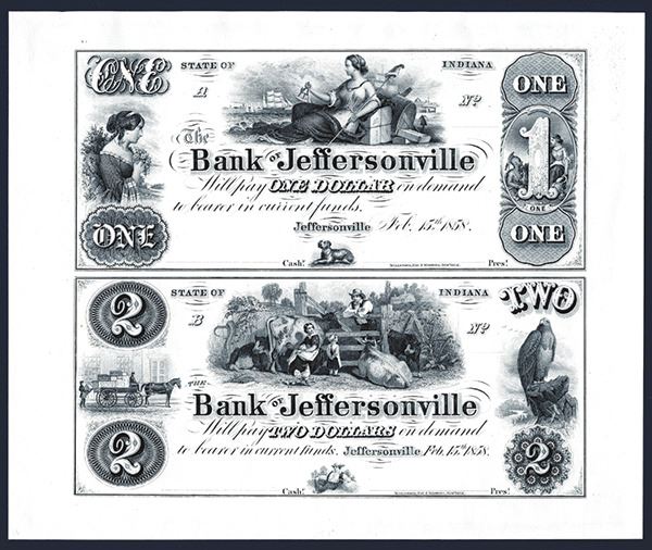 Jeffersonville, Indiana. Lot of 2 notes (uncut sheet of 2), 1858 (ca.1970's), $1-$2, (IN-280-G2a; G4a), Modern "Proprietary Proofs". The $1 proof has woman holding flowers on left and seated allegorical woman with ships in middle. Black printing without underprint, printed on thin white card, CU to Gem Uncirculated condition. WH&W. Archival "Proprietary" proofs rarely seen in sheet form.