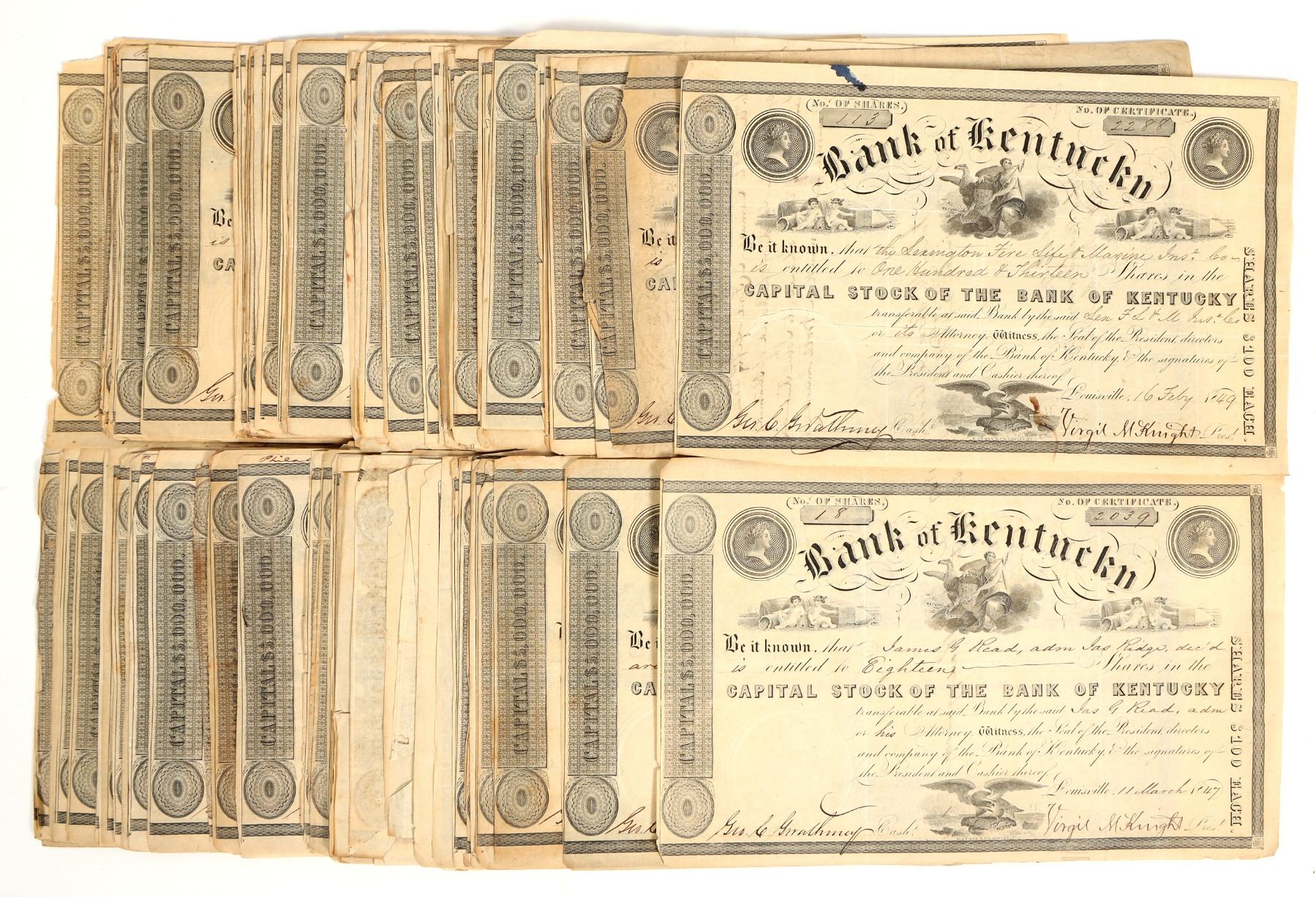 About 160 Bank of Kentucky stocks issued in the 1840s, signed by documented slave-trader Virgil M. Knight (aka Virgil McNight) a man who was later credited with preserving the credit and good-faith of the State of Kentucky when he saved the Bank of Kentucky's reputation from scandal by honoring its debts following the "Crash of 1837", after H. J. Levis, the Cashier of Schuylkill Bank (principal stock agent of the Bank of Kentucky) fraudulently issued 4,500 shares of the Bank of Kentucky fleeing the Country when stockholders discovered the crime. [Ref: Flight to Freedom by Karolyn Smardz Frost, and article published in Kentucky Humanities 2008 Periodical; The Logans. 163 Bank of Kentucky, Cincinnati & Hamilton Public Library digital archive; The Schuylkill Bank Fraud by Will D. Gilliam, Jr., article published by Kentucky Historical Society journal July, 1952]