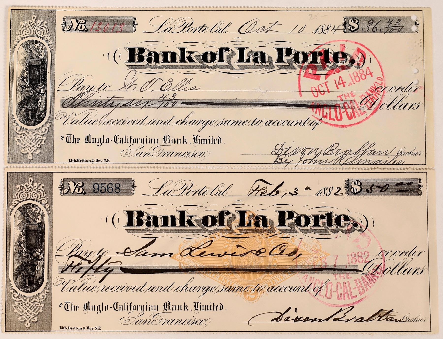 1) 1882, Dixon Brabbon cashier. To Sam Lewis & Co. for $50. 2) 1884. Signed by Snailesw for Brabbon. $36.43 to W. T. Ellis.