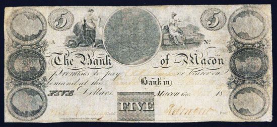Macon, Georgia, 18xx (ca.1820's), $5, (GA-195-G18), Issued obsolete banknote, Medallions on left and right with cameo portraits, circular cameo with coin appearance in middle flanked by 2 small allegorical women, VG to VG+ with no pin holes or obvious edge faults, DUBS.