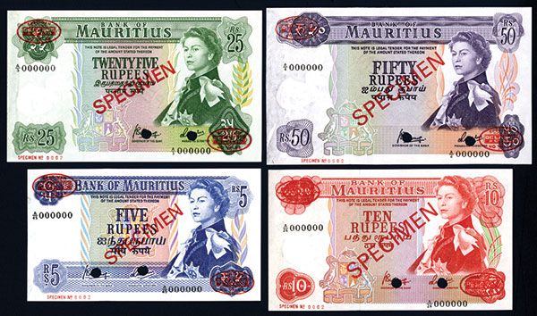 Mauritius, set of 4 specimen notes, includes 5 Rupees, P-30s; 10 Rupees, P-31s; 25 Rupees, P-32s; and 50 Rupees, P-33s. Generally Choice AU with mounting traces. All are numbered 0002 and have a red specimen overprint.