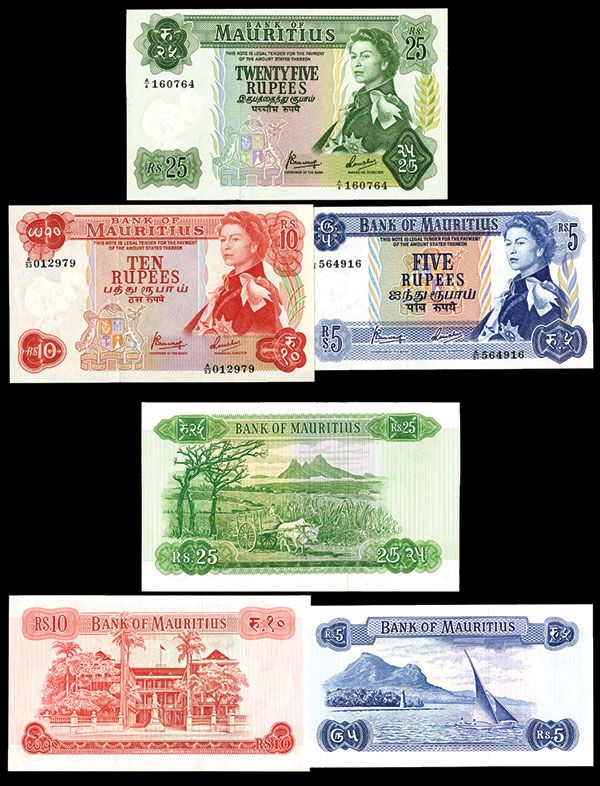Mauritius, set of 3 notes, includes 5 Rupees, P-30; 10 Rupees, P-31; and 25 Rupees, P-32. TDLR. All notes are UNC.