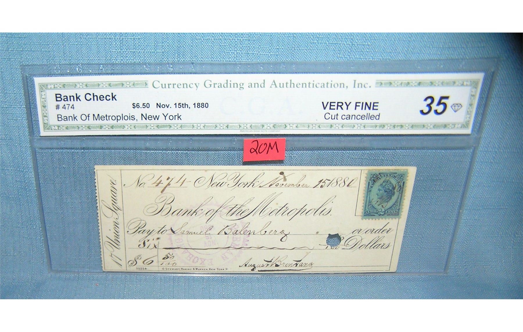 Bank of Metropolis NY bank check with period 2 cent stamp check dated November 15, 1880 graded very fine est. value $50.00-$75.00