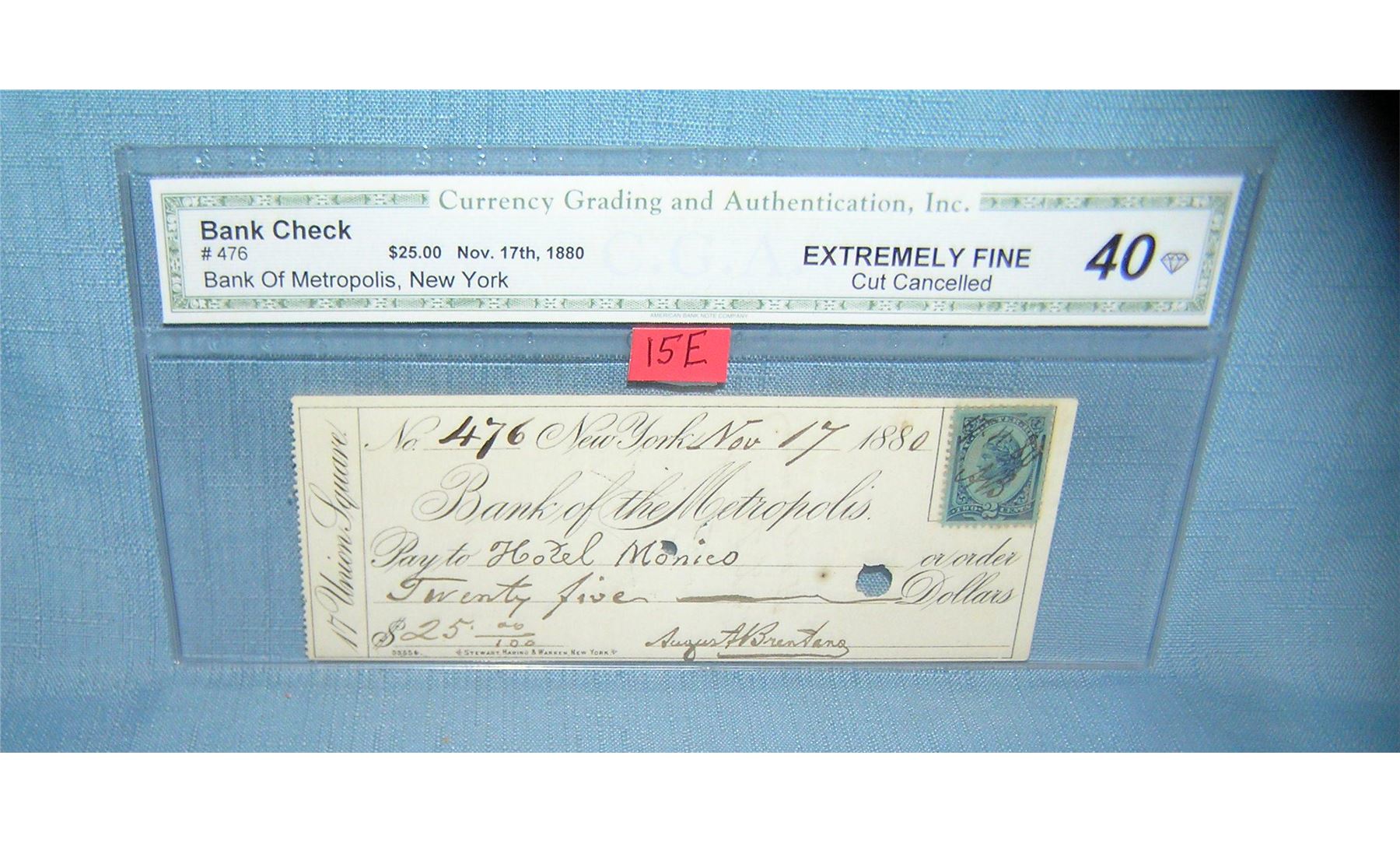 Bank of Metropolis NY bank check with period 2 cent stamp check dated November 17, 1880 graded extra fine est. value $65.00-$75.00
