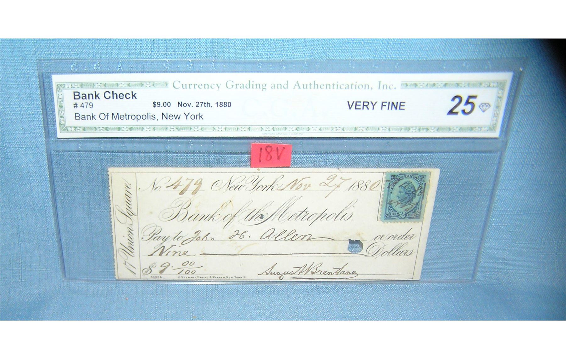 Bank of Metropolis NY bank check with period 2 cent stamp check dated November 27, 1880 graded very fine est. value $50.00-$65.00