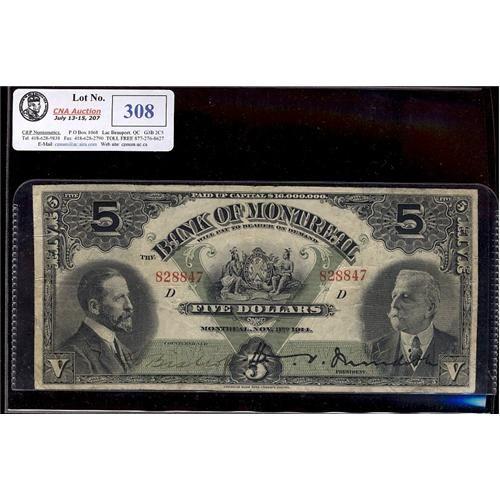 Bank of Montreal 1914 $5 CH505-54-02. A nice solid example in F condition. #828847