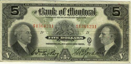 Bank of Montreal 1931 $5 S1364231 F-VF. First one seen by the cataloguer. Usually comes with no letter before the serial number. Excpect strong bidding on this rarity!