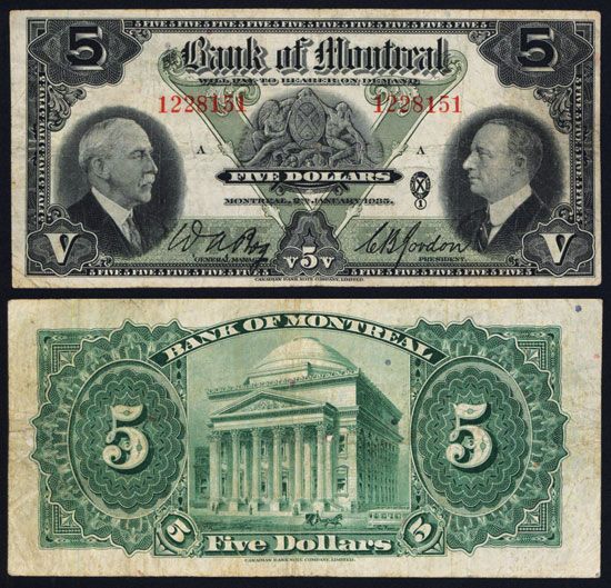 Montreal, Canada, $5, P-S558b, Issued banknote, Arms in middle flanked by portraits of Dodds on left and Sir Charles Gordon on right. Black on olive green, S/N 1228151, back green with bank building, Fine+ to VF condition, pp A, Canadian BNC.