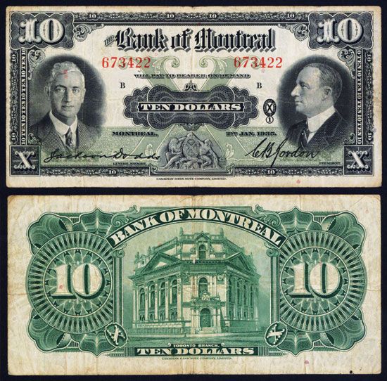 Montreal, Canada, $10, P-S559b, Issued banknote, Arms in middle flanked by portraits of Dodds on left and Sir Charles Gordon on right. Black on olive green, S/N 673422, back green with bank building, Fine+ to VF condition, pp B, Canadian BNC.