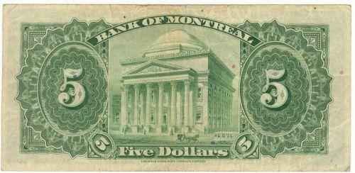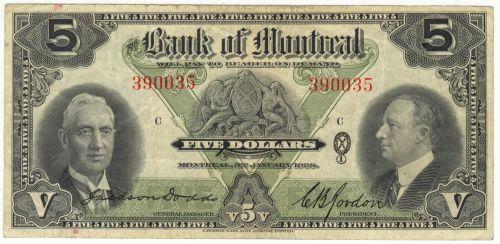 Bank of Montreal $5.00 note 1935 in Very-Fine, 505-60-02, serial 390035.