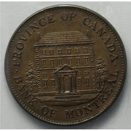 <B>Bank of Montreal Halfpenny token 1844,,</B></I> Br-527, Ch-PC1B3, MS60 ICCS. Sharply struck with traces of luster on the reverse.