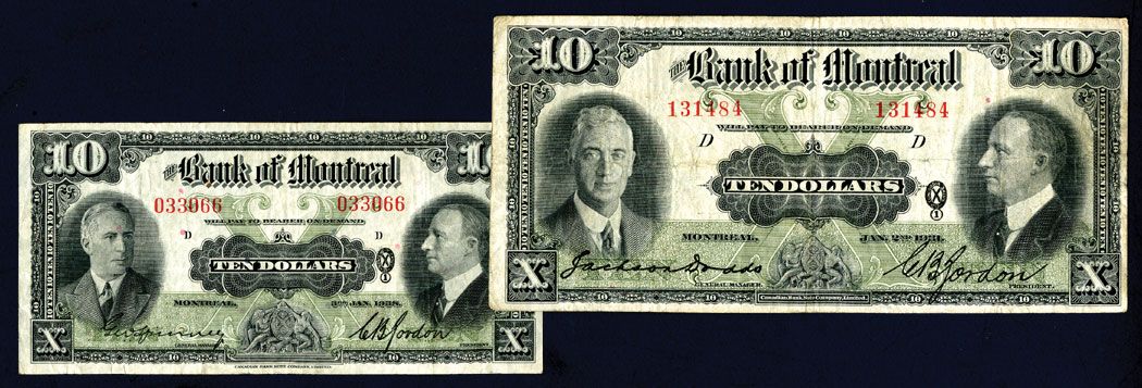 Canada, Bank of Montreal, pair of notes, includes $10, 1931, P-S554; and $10, 1938, P-S562. Both black on olive-green underprint and both in Fine condition.