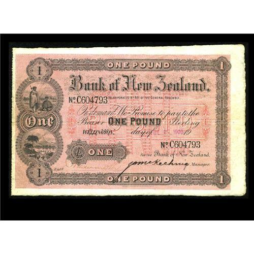 <B>New Zealand</B></I> Bank of New Zealand <$1 July 1, 1909 Pick UNL<BR>A bright and attractive example which bears the design of Pick S212 but displays the unlisted date of July 1, 1909 and is pink and red tinted, which is an unlisted color for this design. Currency from this country has been on a tear of late, with rising prices and considerably increased collector demand. <B>Very Fine.</B></I>