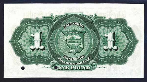Kingston, Jamaica (Canada), £1, P-S131s, 550380204S, Specimen, Black on olive green and light yellow, Allegorical man and woman flank denomination counter, back green, Specimen and "000000" overprints, POC's, PMG graded Choice Uncirculated 64 EPQ. Very attractive and scarce note. ABNC.