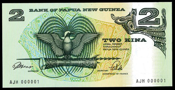 PNG, 2 Kina, P-5c, S/N AJH000001, Signature #3, PMG graded Gem Uncirculated 65 EPQ.