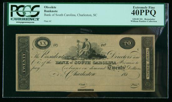 Bank of South Carolina, Charleston, SC. $20.00 181_ Remainder. PCGS Extremely Fine 40PPQ. A lovely, minimally folded example of this scarcer early type that is very seldom seen in any condition.