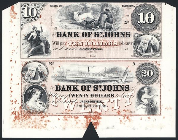Jacksonville, Florida, 18xx (printed originally in the 1850-60's, this sheet is ca.1960-70's), $10-$20, FL-30-G4b; G6b, Modern "Proprietary Proof", Black printing with red underprint, printed on thin white card with 3 large margins, Choice to Gem Uncirculated condition but evidently the plate had either rust or small dents which has shown up as spots of extra red on the paper, still attractive and rare proof sheet. ABNC.
