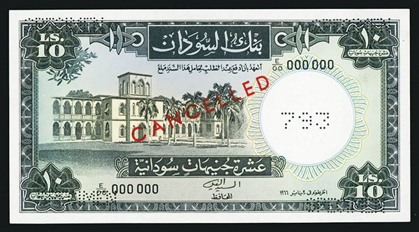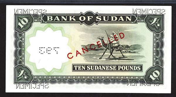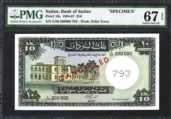 Sudan. 1966. 10 Sudanese Pounds, P-10b, Unlisted Specimen banknote. Black on m/c underprint with building on left, back black on m/c with soldier on camel on right. Red "Cancelled" overprints, black "000000" serial numbers and POC's. The note has pin punch "specimen" on all 4 corners. PMG graded Superb Gem Uncirculated 67 EPQ. One of the finest known and will be very difficult to improve upon.