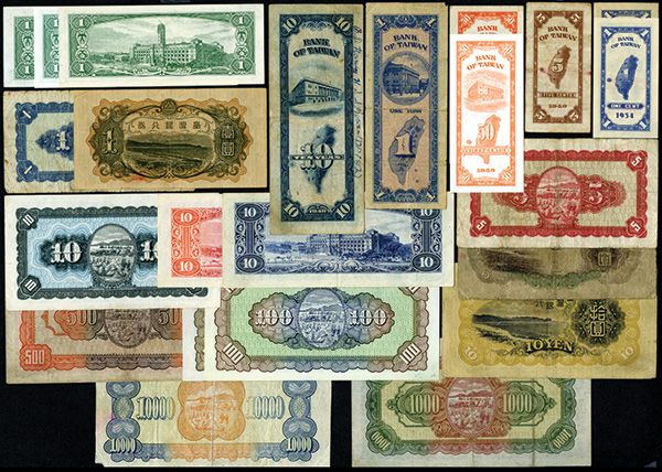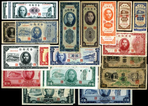 Taiwan, China. Lot of 23 notes, Highlights include ND (1932) 10 Yuan, P-1927a; 1946 Issues, 1; 5; 10; 100 & 500 Yuan notes, P-1935-1940; 1947-49 Issues, 1000 & 10,000 Yuan, P-1942 & P-1944; 1949 Issues, 1ct; 5cts; 50cts (2); 1 Yuan, P-1950 plus additional later issues. Please inspect. Sold "As Is", no returns accepted.