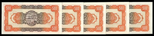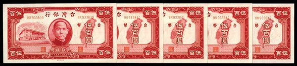 Taiwan, China. Lot of 5 sequential serial number 500 Yuan, P-1940 S/M#T72-6, Issued banknotes, Red with SYS at center flanked by building with small car in front on the left and map of Taiwan on the right, S/N's BR 933839 to BP 933843, All are in Superb AU condition but a very light diagonal bend on the upper left corner of each note keeps them from Gem Uncirculated condition. CPF